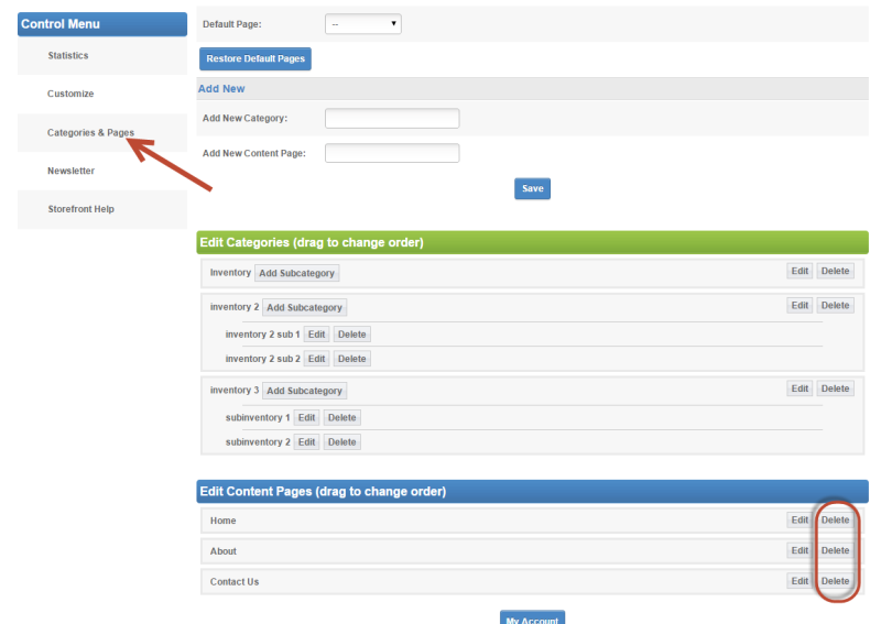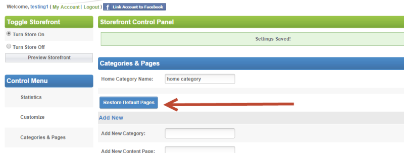 Within that admin tool you'll see the "delete" button next to each storefront page. Click each of those links. Once all the pages are deleted you'll see the Restore Default Pages button as shown below: